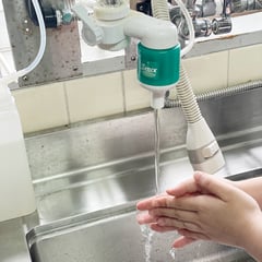 次亜塩素酸水生成装置となると大変高額で電源も必要ですが、ステリアップは蛇口に取り付けるだけで自動的に希釈されて出てくる仕組みです。補充する時も2種類の袋をそれぞれ1袋ずつ入れて、容器の目盛まで水を入れるだけなので簡単です。弊社でも給湯室に取り付けて手を洗ったり、スプレーボトルに移して掃除に使ったりしています。